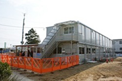 いわき市の三宝保育園は、地震で園舎に大きなダメージを受けました。自治体から「使用不可」とされながらも、一日も早く保育活動を再開させるため、被害が殆ど無かった小さな部屋に子どもたちを集め、震災から約2週間後の3月27日に保育を再開。しかし、地震による被害が大きかったいわき市内はもとより、原発事故などによって住む場所を追われた多くの方々がいわき市に避難されたため、入園希望が増加していました。こうした折、園の関係者が、当協会がスタートさせた幼稚園・保育園再建支援の取り組みを当協会のホームページでご覧になり、支援を要請。いわき市からも当協会による支援が必要との意見書を戴き、2011年11月、プレハブ園舎を提供しました。