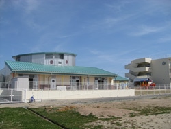 | 新装なった宮城県亘理町の吉田保育所。右奥は、長瀞小学校。「もしも」の時、吉田保育所の子どもたちは、3階建ての小学校校舎に避難する。4年前の「あの日」も、吉田保育所の園児たちは、近隣の小中学校に逃れ、全員無事だった。 |