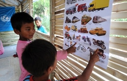 | ユニセフが支援する仮設の学習センターで学習用ポスターを見る7歳と5歳の男の子たち。 |