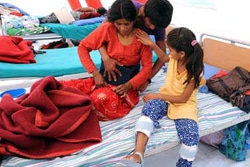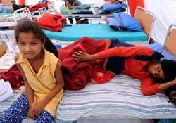 | 脊髄損傷リハビリセンターのテントのベッドで横になるシタさんとラミタさん。 |