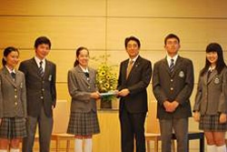 | J7で作り上げたポジション・ペーパー(提案書)を安倍首相に手渡す日本代表の高校生たち。 |