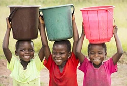 | バケツを頭にのせる3人の女の子。新しい給水所のおかげで、遊ぶ時間が増えた |
