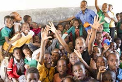 | 「水は未来」と黒板に書いたミクラティ学校の生徒たち |