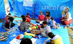 | ユニセフが支援する「子どもにやさしい空間」で遊ぶ子どもたち。守られた環境で安心して過ごすことができるこの空間で、子どもたちはスポーツをしたり、遊んだり、絵を描いたりできる。 |