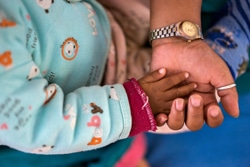 | ユニセフが支援する外来治療プログラムセンターで微量栄養素パウダーを受け取った親子。(5月撮影) |