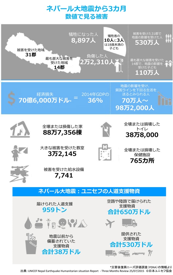ネパールで4月25日に発生した最初の大地震から3カ月。子どもたちは引き続きさまざまなリスクに直面しています。家族はさらなる貧困に陥り、いまだ支援を必要としているのです。