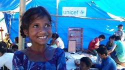 | ユニセフが支援する「子どもにやさしい空間」で笑顔を見せる女の子。 |