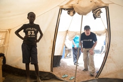 | 7歳のジャワハーちゃん一家が身を寄せるマルキャズィー難民キャンプのテントの中に入るイザード大使。 |