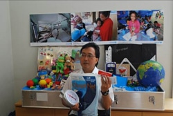 | 現場で活用される支援物資を手に、ユニセフの緊急支援活動を説明する穂積代表。 |