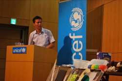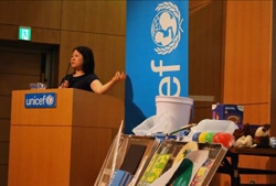続いて、関根一貴 保健専門官、および鈴木惠理 子どもの保護専門官よりユニセフが活動する5つの柱「水と衛生・保健・栄養・教育・子どもの保護」の活動概要と支援の成果を、写真を用いて報告しました。