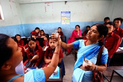 | 学校を訪問し、コレラに関する知識の普及と、水質チェックについて啓発をするコミュニティのボランティア保健員 |