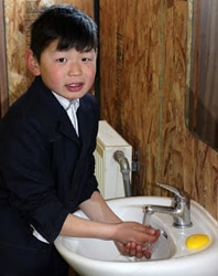 これまでのところ、15の「ウォッシュ・ハウス」がゲルの中の幼稚園や通常の教室に導入されており、約1,400人の幼稚園や小学校の子どもたちが恩恵を受けています。10歳のバルジニャム・バドリくんもそのひとりです。