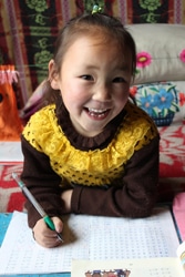 | ブスグル県のゲルの中の幼稚園に通う6歳のウルジチメグちゃん。 |