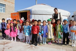 | ゲルの中の幼稚園に通う子どもたち。 |