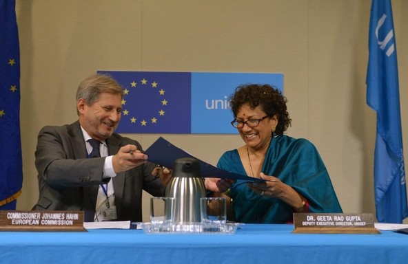 合意書に署名する欧州委員会のヨハネス・ハーン氏(左)とユニセフ事務局次長のギータ・ラオ・グプタ。 |