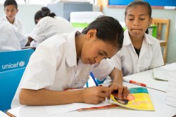 ユニセフはこれまでに、東ティモールで59校の「子どもにやさしい学校」を建設しています。それらの学校に加え、さらに62校に、学習教材の提供や教員研修の支援をしています。これらは、東ティモール政府による「Eskola Foun(新しい学校)」イニシアチブの一環で、ユニセフはこのイニシアチブを支援しています。