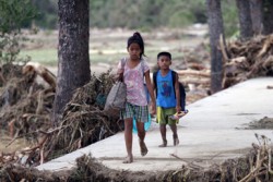 被害を受けたヌエヴァ・エシハ州の町で、瓦礫の中を歩く子どもたち。 |