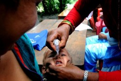 最も甚大な被害を受けた14の郡のうちのひとつ、Kavrepalanchokでポリオの予防接種を受ける子ども。 |