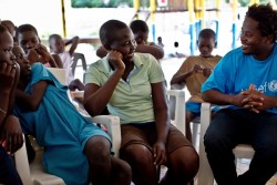 2015年11月21日、元子ども兵士でユニセフの「紛争の被害にあった子どものための代弁者」、イシュマエル・ベアが、南スーダンの首都ジュバにある支援センターの子どもたちを訪問しました。