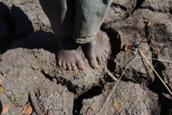 干ばつでひび割れた土の上に立つ男の子(マラウイ、2002年撮影) |