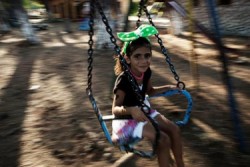 レスボス島の難民一時受け入れ所で笑顔を見せるマラクちゃん(7歳)。 |