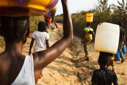 頭に水を入れたバケツを乗せ、自宅に戻る人々。(コンゴ民主共和国) |