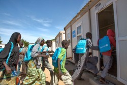 国内避難民キャンプにある学校で、ユニセフの支援物資の通学かばんを身につけて教室に入る子どもたち。 |