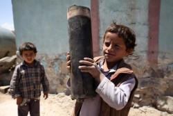 首都サヌアの近郊にある村で、爆発した砲弾の残骸を手にする男の子。 |