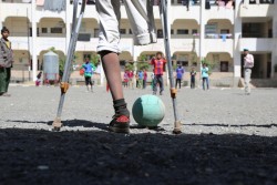 ユニセフの「子どもにやさしい空間」でサッカーをする、爆弾で8歳の親友と片足を失った男の子。(イエメン) |