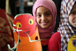 ユニセフの「子どもにやさしい空間」で、歌や工作のアクティビティに参加する子ども。(イエメン) |