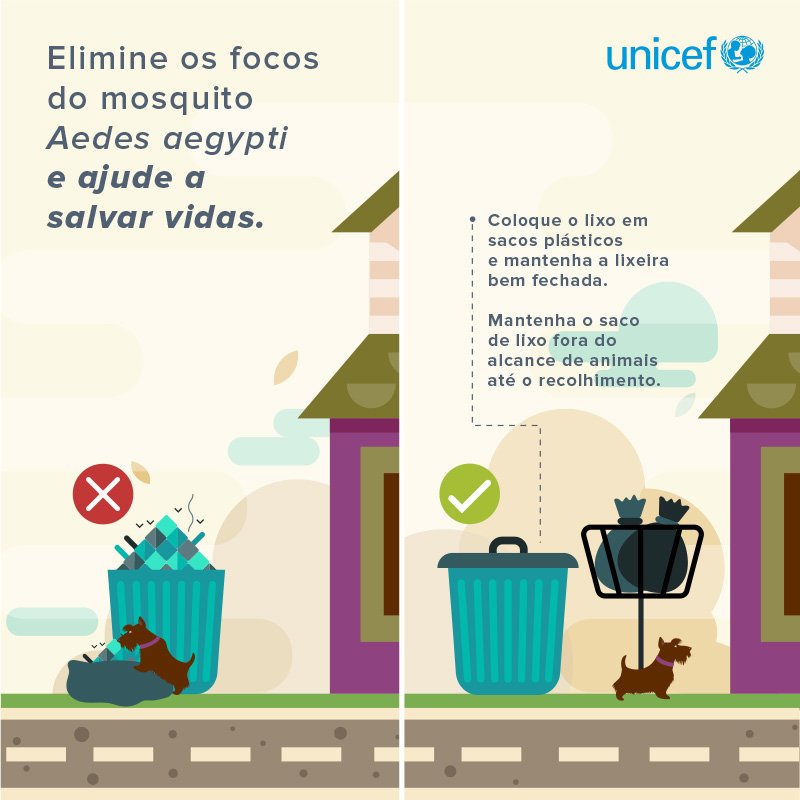 『ゴミ箱・ゴミ袋の蓋をしめ、回収まで適切に保管しましょう』と書かれた啓発ツール。 ジカウイルスを媒体する蚊の発生を防ぐため、ユニセフ・ブラジル事務所は国民に向けて啓発活動を行っている。 |