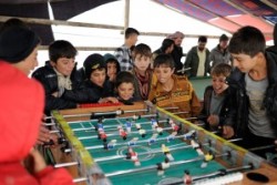 テントのなかでデーブルサッカーをする子どもたち。 |