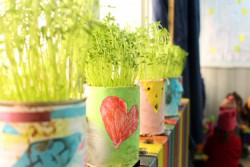 瞬く間に300以上の空き缶が集まりました。子どもたちみんなで空き缶を飾り付けし、ボランティアの人たちが提供した成長の早いレンズ豆などの豆の種を植えました。