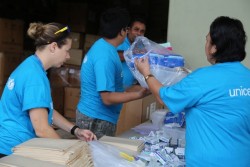 首都スバにあるユニセフの倉庫で支援物資の水と衛生キットや学校用の物資を詰めるユニセフのスタッフとボランティア。 |