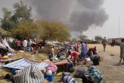 避難施設が全焼し、マラカルの文民保護区内の道路に避難する子どもたちや家族。 |