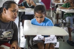 「本来であれば、ヤップ州の特殊教育局によって、グレースちゃんの通学に付き添うフルタイムの専門職員が派遣されるはずなのですが、そのような職員はここにはいません。だから、なんとかして時間を作って、毎日8時から正午まで、娘に付き添って学校に行くことにしたのです。現地語、ヤップ語、英語、算数、理科の勉強を手伝います」とロージーさんは話します。