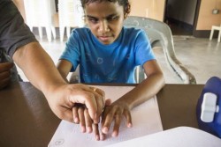 「他にやってくれる人がいないので、私がやるしかないのです。ヤップでは点字の本が手に入らないので、自分で作る方法を学びました。ヤップ語と英語で作ります。時間が足りないので、一番大事な本だけです。必要な本全部を点字にすることはできません。ほかの2人の子どもたちの面倒も見なければいけませんから。目の見えない子の中で、島で学校に通っているのは娘だけです。ほかの子どもたちは、親が音を上げてしまうので、学校に通わずに家にいるほかないのです」とロージーさんが語ります。