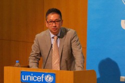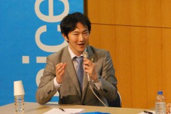 損保ジャパン日本興亜ホールディングス・損害保険ジャパン日本興亜 CSR部特命課長の市川アダム博康氏は、地球環境や社会の様々な変化の中で、各種の国際的イニシアティブに参加しつつ、事業活動を通じて社会的課題の解決とグループの成長の双方を同時に実現するCSRを目指していると述べ、具体的な取り組みとして、まず、子どもに関連した安心・安全・健康に資する商品・サービスを紹介。自動車事故に備える損害保険の提供と平行して、交通事故防止にも長年取り組んできたとして、「黄色いワッペン贈呈事業」を紹介しました。また、子どもの貧困問題に関連した、保護者の経済状況悪化による子どもの教育への影響に備えた「学業継続支援サービス保険」等も説明し、保険会社には保険を通じて社会基盤をサポートする役割がある、と述べました。