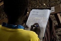小学校の卒業試験が再開され、ベンティウの文民保護地区で試験を受ける生徒。 |
