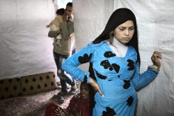 レバノンに避難しているシリア難民の14歳の女の子。まだシリアにいた1年半前に結婚したが、その半年後に夫を亡くした。当時妊娠していたが、悲しみと痛みによって流産したと彼女は話す。 |