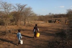 水を汲みに歩く母子 |