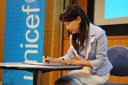 ユニセフ・アジア親善大使の任命状に署名するアグネス大使。 |