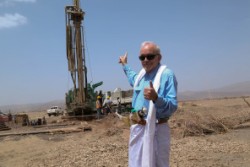 ユニセフが支援する井戸の掘削作業中の機材を指さす、レーク事務局長。 |