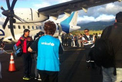 エクアドルの地震被災地へ向かうユニセフのスタッフ。 |