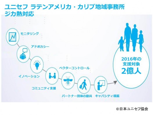 ユニセフは、ジカ熱への対応に必要な計1,380万米ドルの支援を要請しています。これには、ラテンアメリカ・カリブ諸国における緊急対応に必要な880万米ドル、予防や研究開発に関する世界規模での支援の取り組みに必要な500万米ドルが含まれています。
