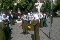 スポーツの時間にバレーボールをする子どもたち。劇やスポーツは紛争について忘れ、勉強に集中するための力となっている。 |