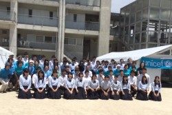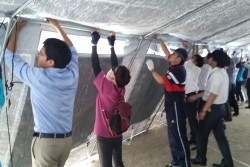熊本第二高校の先生や熊本県ユニセフ協会のボランティアのみなさんの手で組み立てられるユニセフ学校用テント |