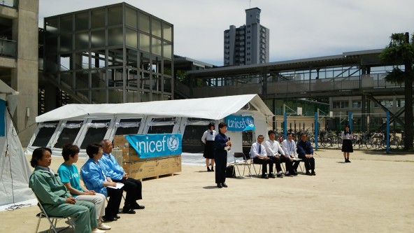 熊本県内では、四半世紀にわたりユニセフの広報・募金活動に取り組む熊本県ユニセフ協会が、長年にわたって築いてきた地域のネットワークを駆使し、地震発生直後から、様々な支援団体と支援を必要とする“現場”や行政と繋ぐとともに、幼稚園や保育園などへ全国から寄せられた玩具などを届けています。今回のテント寄贈も、こうした活動の中で、県の教育委員会から熊本県ユニセフ協会に寄せられた支援要請を受けて実現したものです。