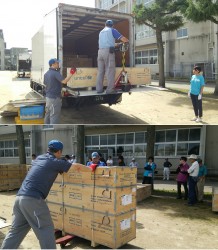 3トントラック2台で運ばれてきた木箱30個に入ったユニセフテント10張。 |
