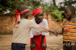 劇を演じ、2人の少年が平和的に和解できるように見守るジャネットさん。ユニセフの支援を受け、ジャネットさんが通う学校でも、平和構築の活動が行われている。 |
